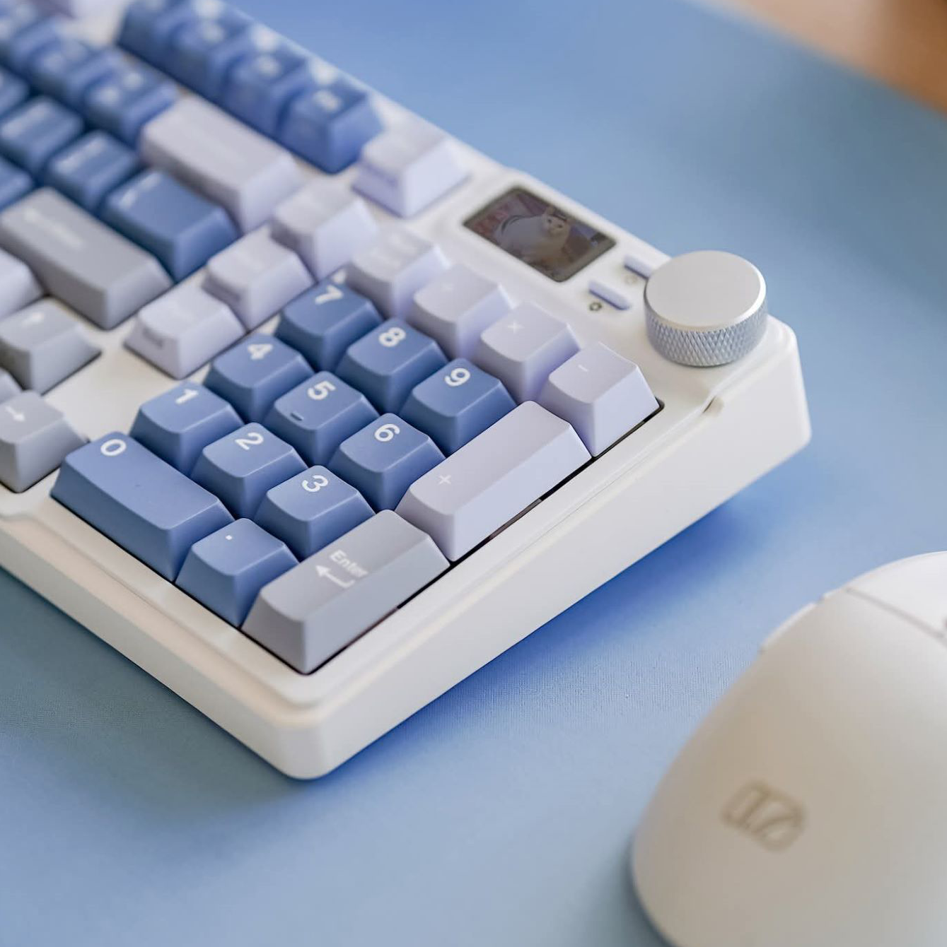 整體黯藍色與點綴的灰色鍵帽相輔相成,米色基底搭配上白色面板,與淡籃紫鍵帽呈現絕佳搭配。