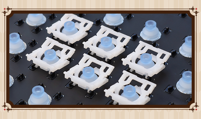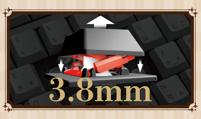 按鍵行程為3.8mm的剪刀腳連桿結構設計,連桿結構動作摩擦聲少,帶來更安靜,按壓各角落均能平衡上下動作不卡鍵,有別於一般鍵盤。